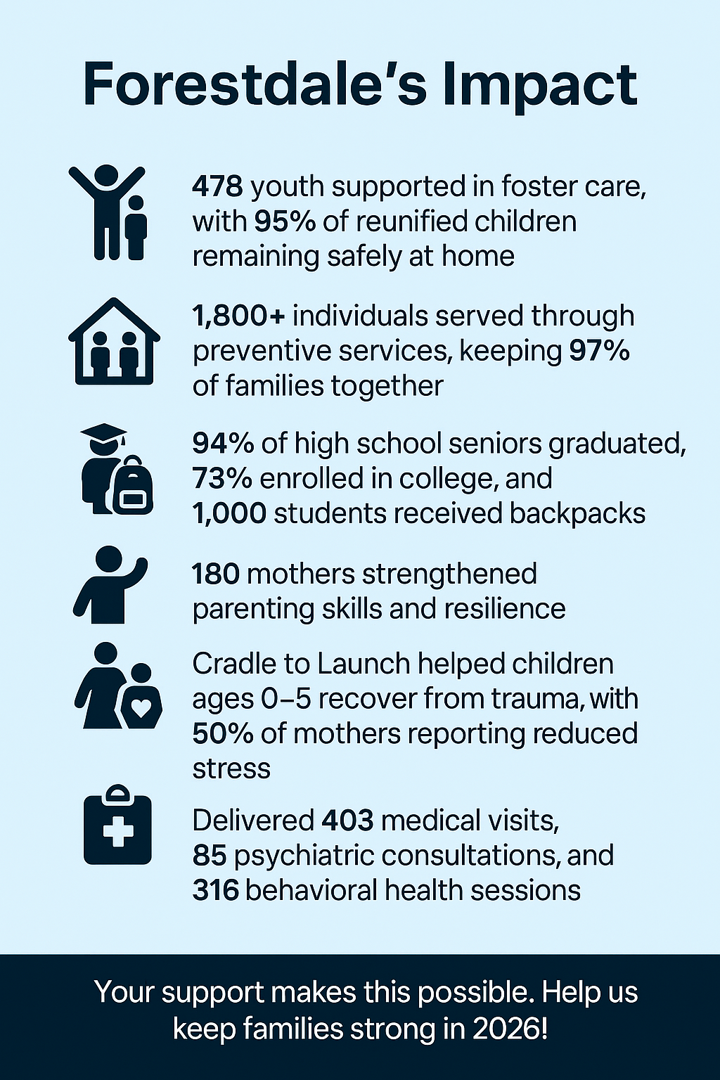 Forestdale’s mission is to ensure every child has a safe, nurturing family and the resources to thrive. When families face crisis, we act—providing parenting support, health care, education, and career pathways. Beyond immediate relief, we work to break cycles of poverty and trauma, building stronger, more just communities. Since 1854, we’ve been family when families need us most.